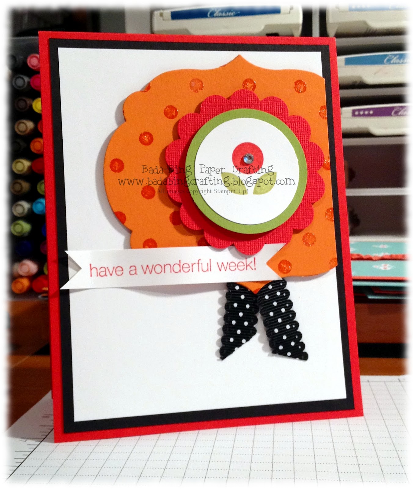 Hi stampers! I played along with the color challenge this week over at the Colour Q and whoa, was that one bright combo!!!! It's really funky and retro! And can I just take a moment to say how much I'm going to miss poppy parade! I got on the poppy train a little late...I didn't love the color the first year it was out...but now I'm addicted! I'm going to have a bit of a pitty party May 31 when we have to say goodbye:( Speaking of saying goodbye...the retired stamp list will be out EARLY this year on April 15th! Accessories will show up later on the 25th! I'm VERY nervous to lose some of my favorites and SU has said to be ready...with the new catalog strategy the lists will be quite long! GLUP!!!!! So, be ready!!!! Anyway, on to something fun!